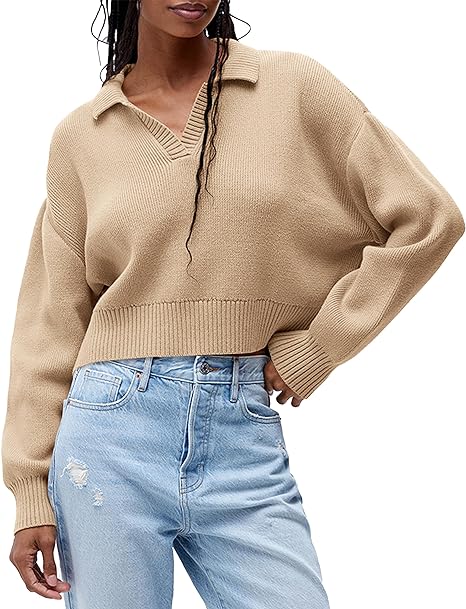 Danedvi Womens V Neck Crop Sweaters Fashion Stand Collar Knit Sweatshirts Long Sleeve Loose Casual